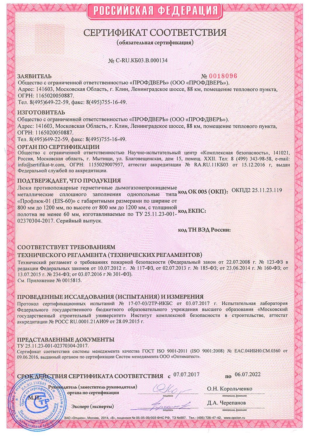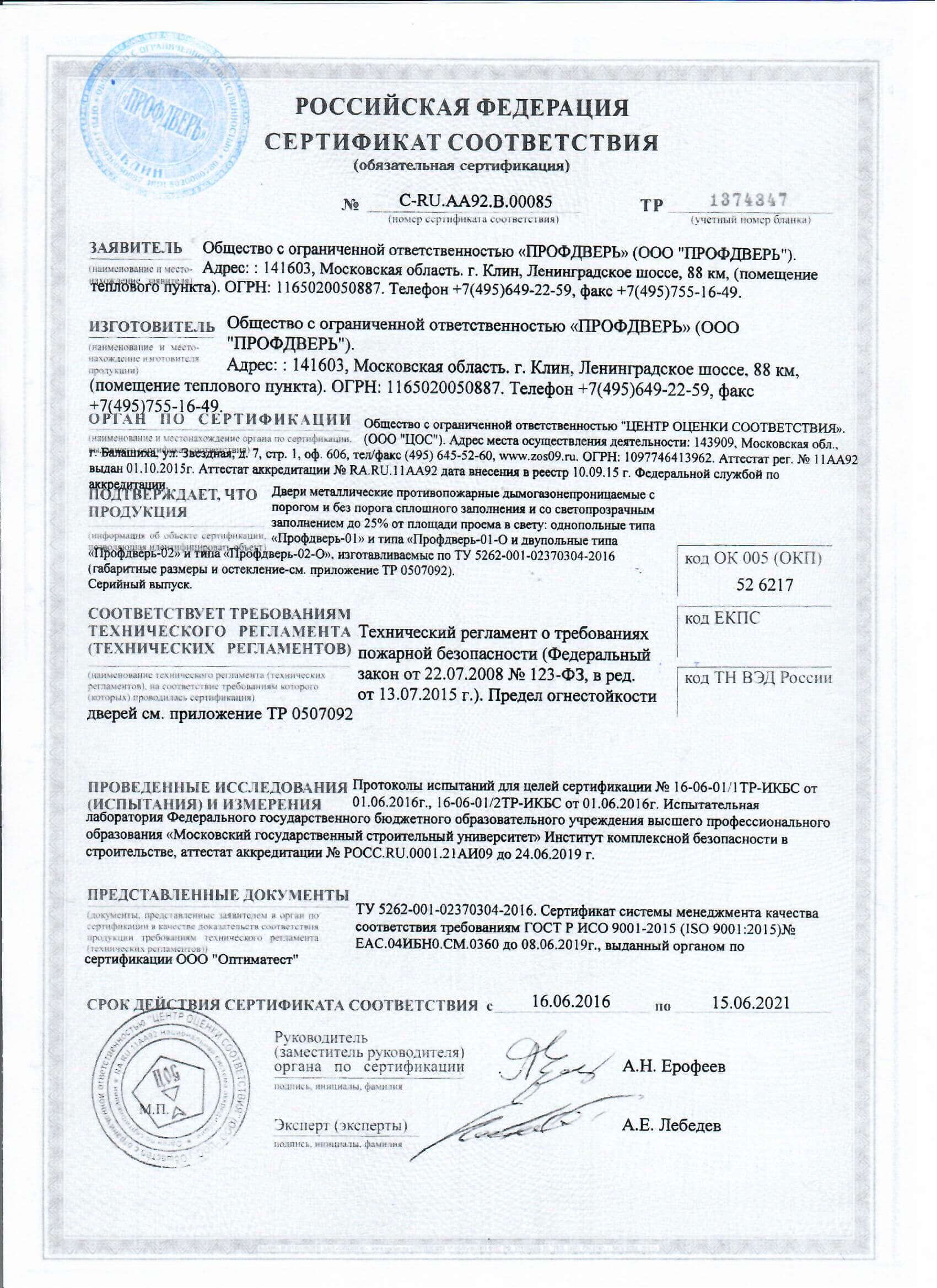 Двери металлические противопожарные дымогазонепроницаемые с порогом и без порога сплошного заполнения и со светопрозрачным заполнением до 25% от площади проема в свету: однопольные типа "Профдверь-01" и типа "Профдверь-01-О" и двупольные типа "Профдверь-02" и типа "Профдверь-02-О"