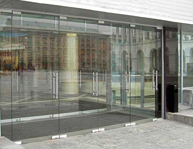Противопожарная безрамная дверь со стеклом в торговый центр в Жуковском